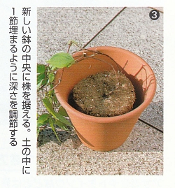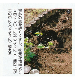 芽が出ていない場合は、1節を土の中に入れて植えつけてください。