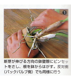 春を迎えたカトレアの株は、急に新芽や新根を出し始めて、成長期に入ったことを教えてく
