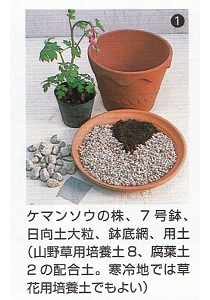 鉢植えの場合は6号以上、できれば8号ぐらいの大鉢を使い水はけのよい山土